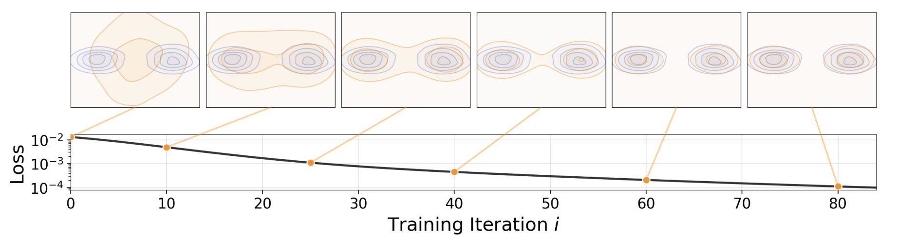 - 图1 漂移模型 :网络fff执行前推操作:q=f#ppriorq=f_{\#} p_{\text{prior}}q=f#pprior,将先验分布ppriorp_{\text{prior}}pprior(如高斯分布,图中未展示)映射为前推分布qqq(橙色)。训练的目标是让该分布逼近数据分布pdatap_{\text{data}}pdata(蓝色)。随着训练迭代进行,我们得到一系列模型{fi}\{f_i\}{fi},对应一系列前推分布{qi}\{q_i\}{qi}。本文的漂移模型聚焦于训练阶段前推分布的演化过程。论文引入了一个漂移场,当分布qqq与数据分布pdatap_{\text{data}}pdata匹配时,该漂移场趋于零。