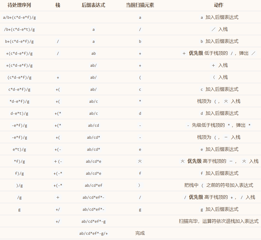 ),则依次把栈中的运算符加入后缀表达式中,直到出现(,从栈中删除(; - 若为除括号外的其他运算符