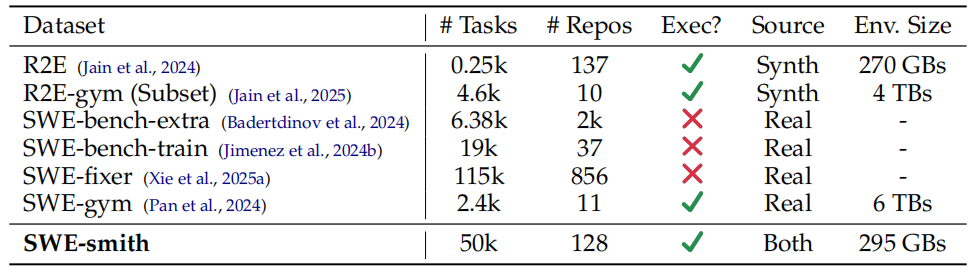 Relative to existing datasets, SWE-smith has multiple times the number of task instances,