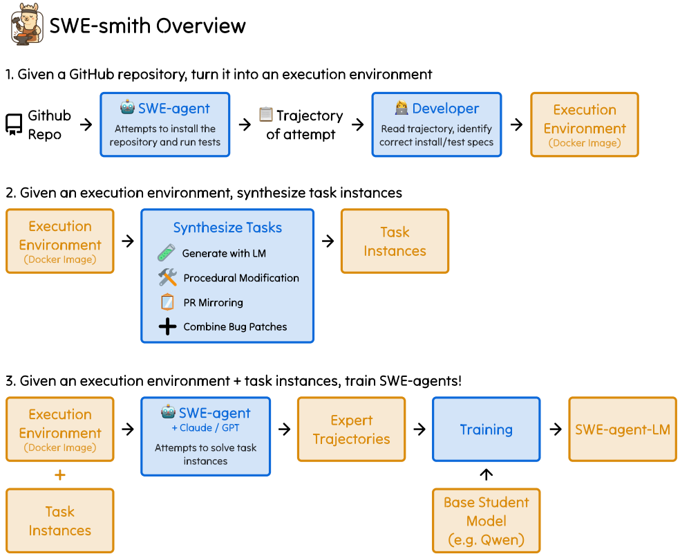 Use SWE-smith to construct execution environments and generate task instances. Use SWE-