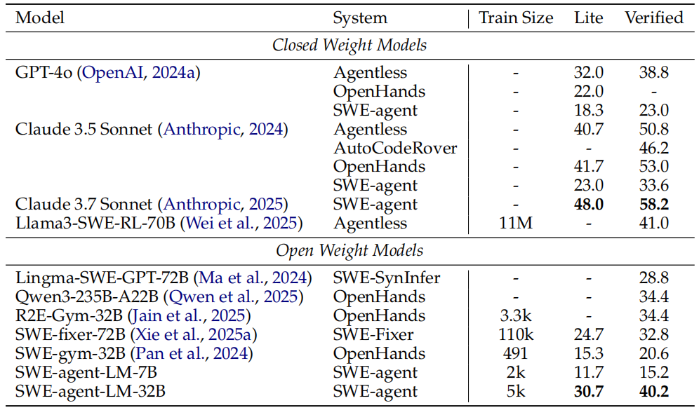 为与先前工作(Jain et al., 2025; Pan et al., 2024)进行对比,我们使用SWE-agent搭配Claude 3.5 Sonnet(800条)或GPT-4o(200条)在1,000个随机SWE-smith任务实例上生成专家轨迹。随后,我们在500条成功轨迹上对32B模型进行微调,这一训练集规模与上述两项工作保持一致。