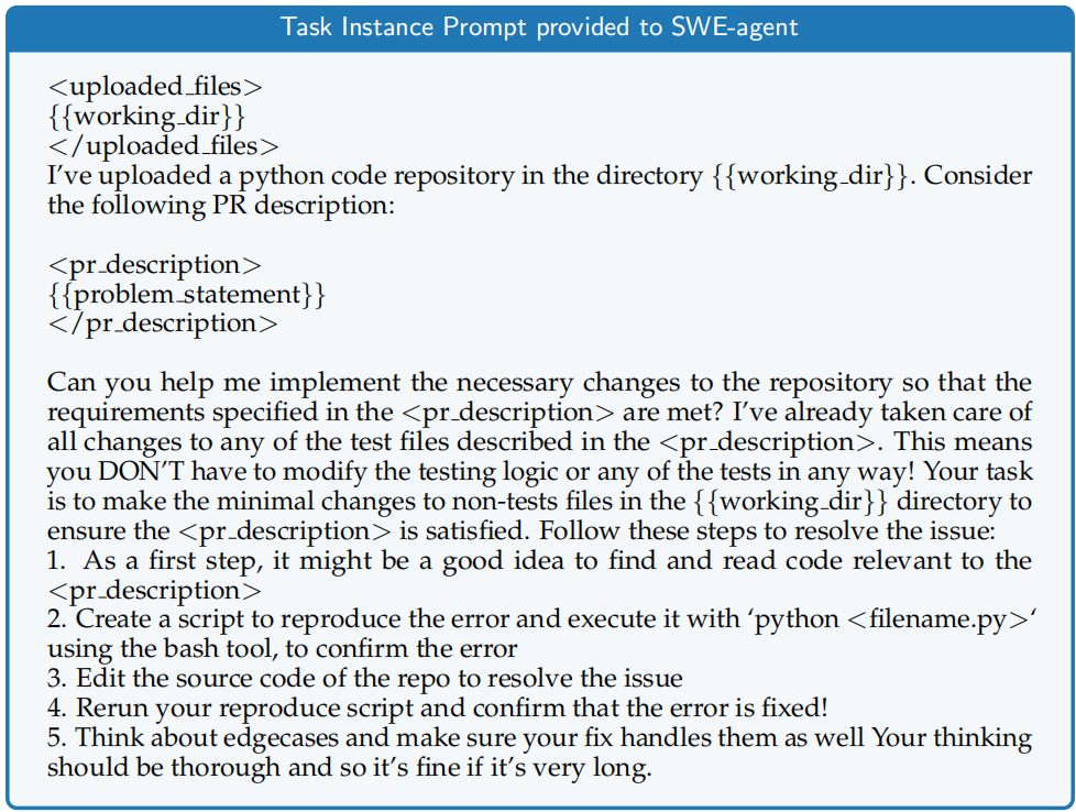 我们使用SWE-agent(Yang et al., 2024a)作为智能体系统,该系统专为解决**GitHub议题[GitHub issues]**而设计。SWE-agent为基础语言模型提供了一个智能体计算机接口(Agent Computer Interface, ACI),使其能够更高效地与代码库进行交互。