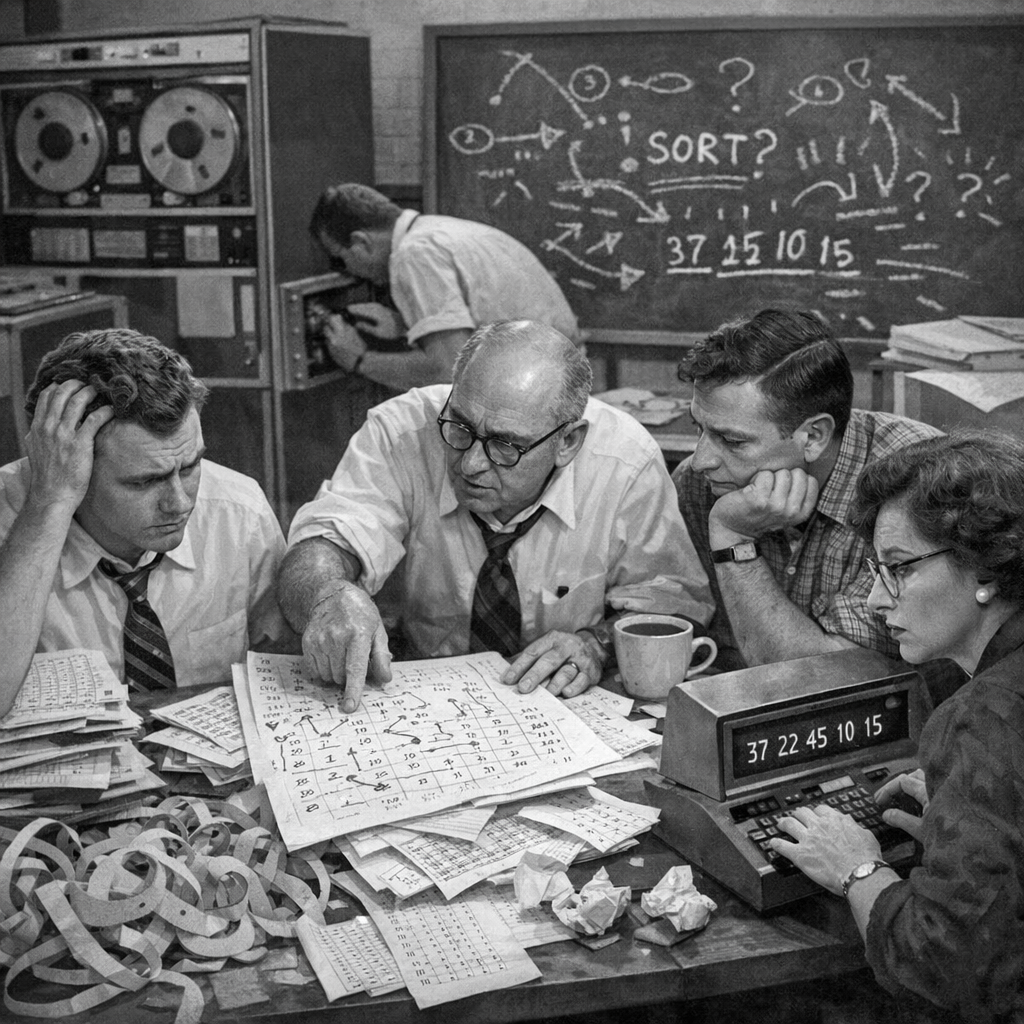 话说在计算机科学的蛮荒时代(大概是上世纪50-60年代),有一群程序员正对着乱成一锅粥的数据发愁。那时候内存比黄金还贵,CPU慢得像蜗牛。关于冒泡排序的"发明人",历史上并没有像牛顿那样被苹果砸中的确切记载,它更像是早期程序员群体中流传出来的一种"生存智慧"。