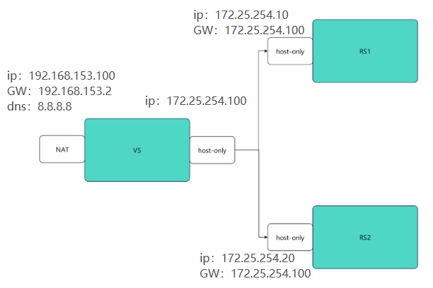 实验环境至少需要5台主机,一台客户端(NAT),一台路由器(NAT+仅主机),一台调度器(仅主机),两台真实服务器(rs1和rs2;仅主机)