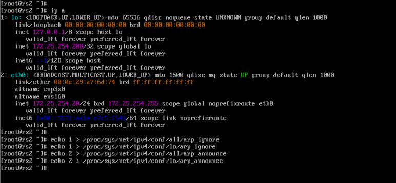 [root@rs2 ~]# echo 2 > /proc/sys/net/ipv4/conf/lo/arp_announce
