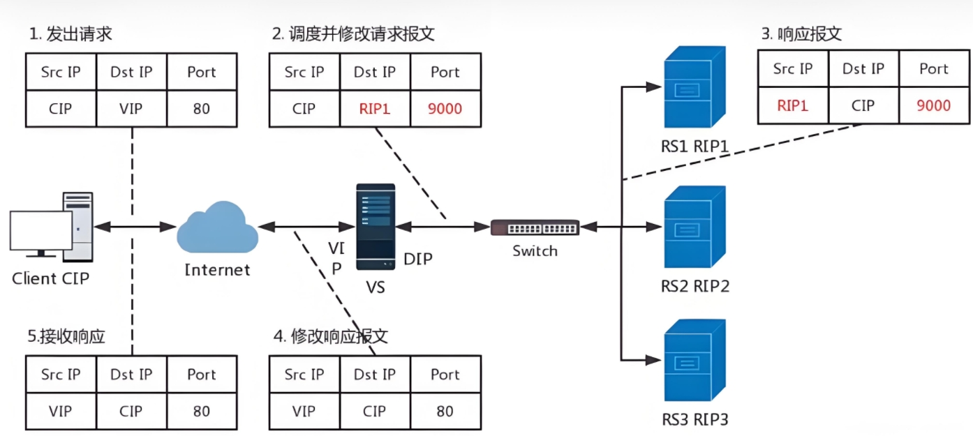 - VS服务器接收到访问请求做DNAT把请求数据包中的目的地由VIP换成RS的RIP和相应端口