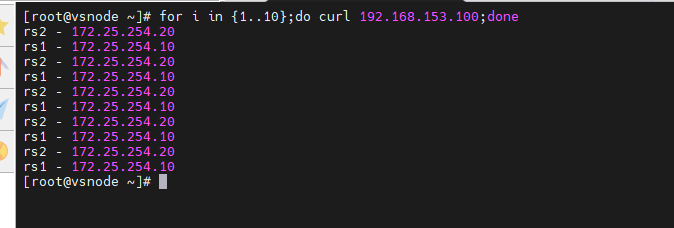 [root@vsnode ~]# ipvsadm -a -t 172.25.254.200:80 -r 172.25.254.10:80 -g