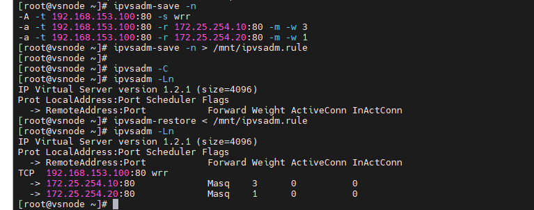[root@vsnode ~]# ipvsadm-save -n > /mnt/ipvsadm.rule