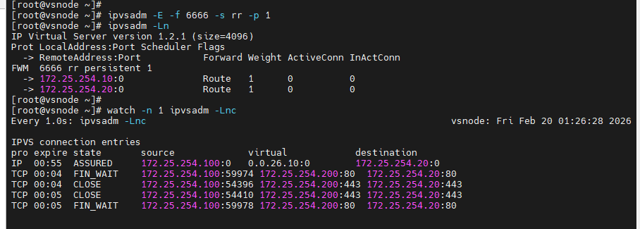 [root@vsnode ~]# ipvsadm -a -t 172.25.254.200:443 -r 172.25.254.20:443 -g