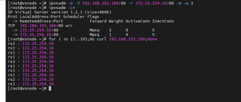 [root@vsnode ~]# ipvsadm -a -t 172.25.254.200:80 -r 172.25.254.10:80 -g -w 1