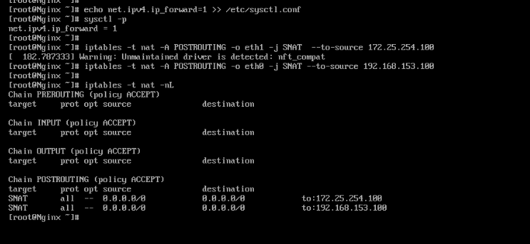 [root@router ~]# iptables -t nat -A POSTROUTING -o eth1 -j SNAT --to-source 172.25.254.100