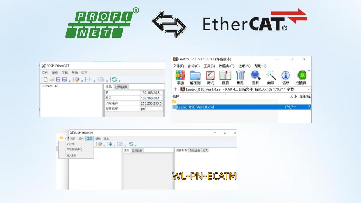 保存组态并下载到PLC,打开网关配置软件,新建项目并设置EtherCAT转Profinet网关IP及设备名称(与PLC组态保持一致,如将pn2ecat改为pn1);添加从站伺服,首先官网下载从站的XML文件;打开配置软件,点击工具选择导入ESI文件;