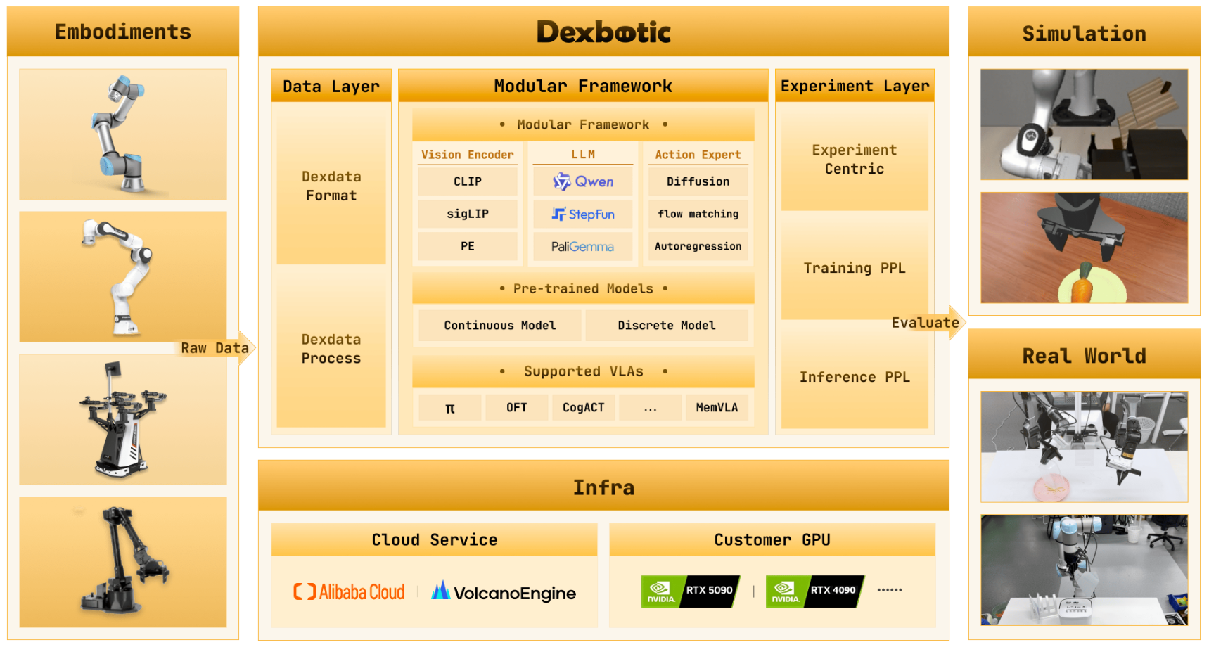 | Embodiments(具身载体) | 提供多源机器人数据输入 | 支持 UR5、Franka、ALOHA 等主流机械臂及其他机器人平台,产生原始数据(Raw Data) |