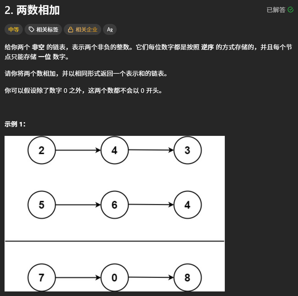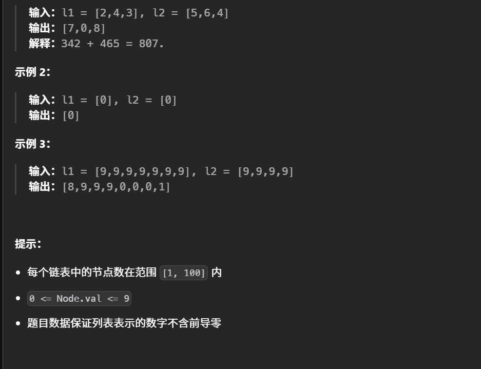 - 输入:两个逆序存储数字的链表(头节点 = 个位,尾节点 = 最高位),比如