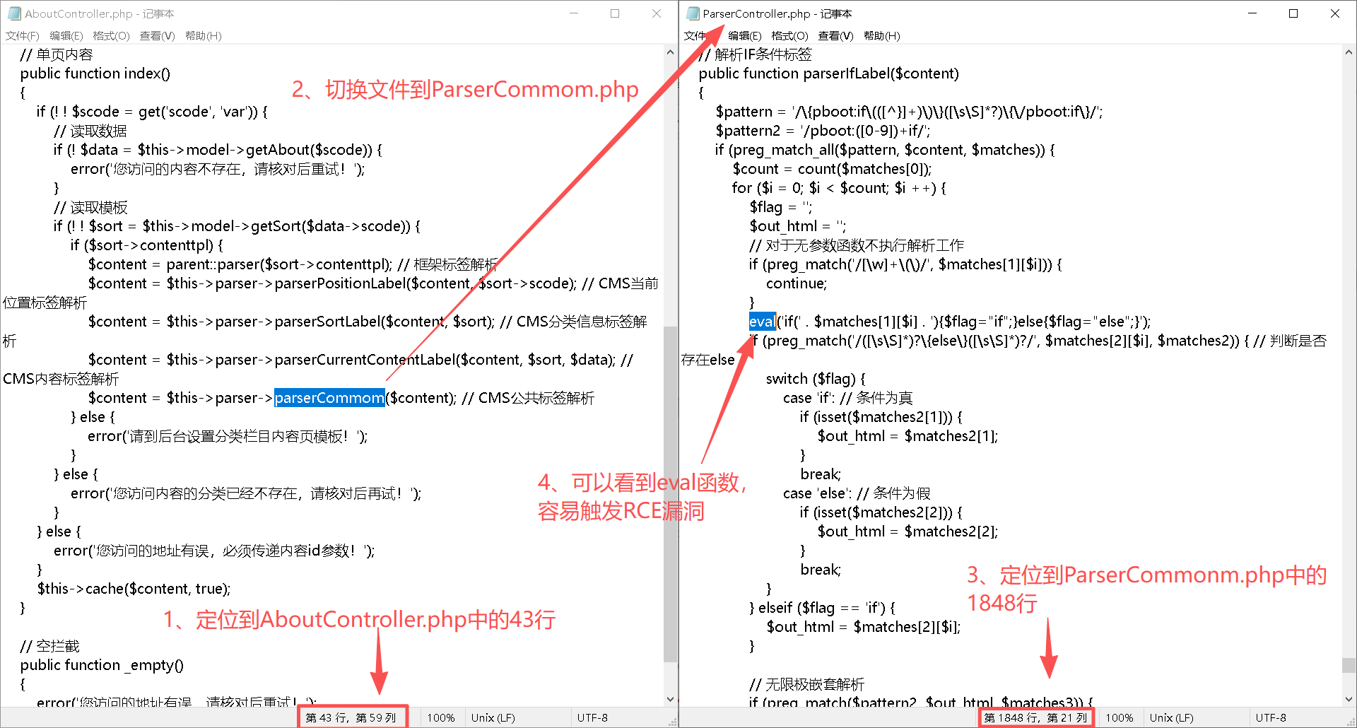 Step3:从图片看到ParserController.php中存在了一个eval函数,且AboutController.php(即"在线留言"页面)调用了ParserController.php模块。