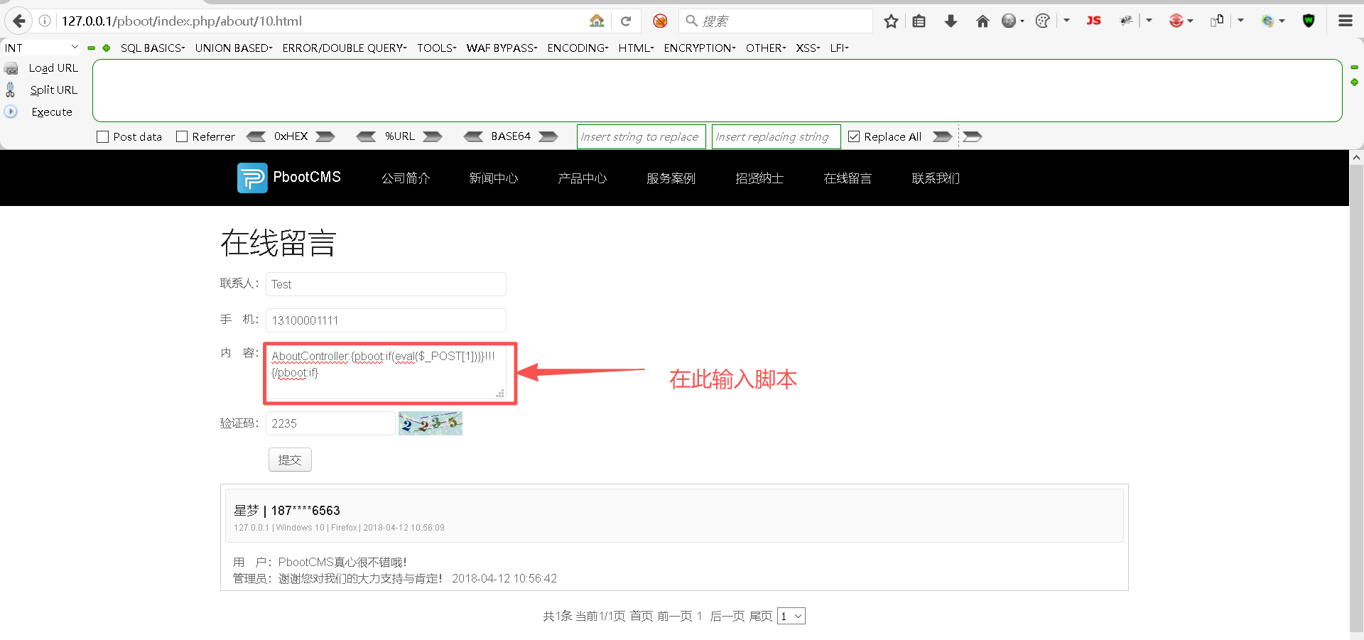 Step4:在 "在线留言" 页面中注入恶意语句