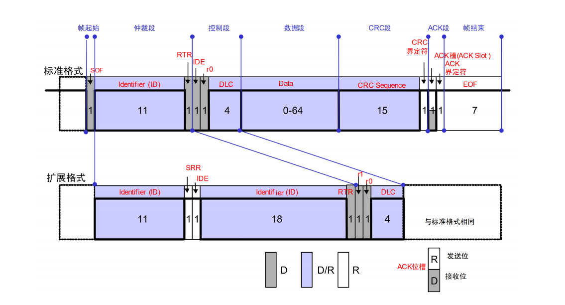 - 标准数据帧的仲裁段由11位ID和1位RTR位(远程发送请求位)组成。RTR 位用于区分数据帧 ( 显性电平)和遥控帧(隐性电平)。