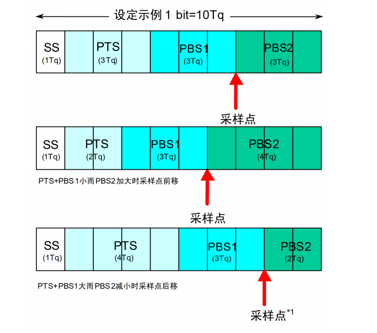 - 所谓采样点是读取总线电平 ,并将读到的电平作为位值的点。位置在 PBS1 结束处。