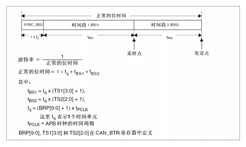 • CAN总线以**"** 位同步 " 机制,实现对电平的正确采样 。位数据都由四段组成:同步段(SS)、传播时间段(PTS)、相位缓冲段1(PBS1)和相位缓冲段2(PBS2),每段又由多个位时序Tq组成。同时Tq的值也是可以配置的。