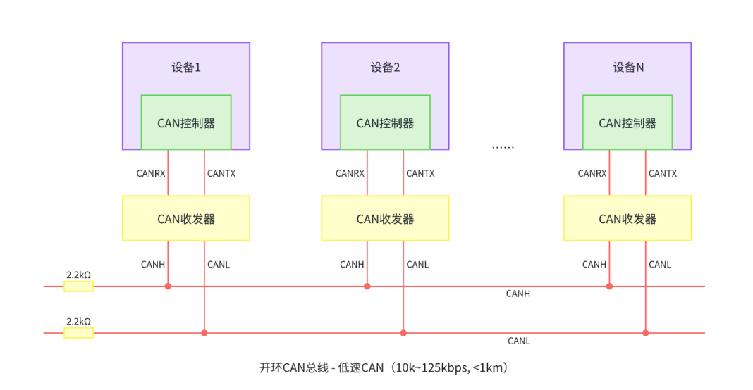 • 通信速度快、距离远:数据传输速率较高,标准速率为125kbps,扩展速率可达1Mbps,且通信距离远,最远可达1KM(速率低于5Kbps)。