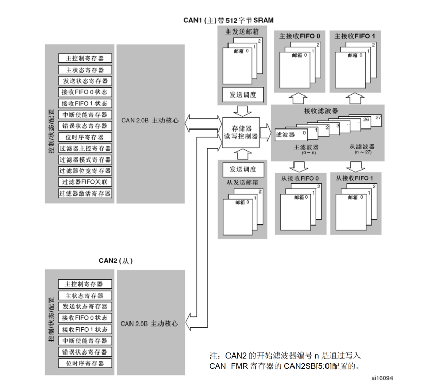 /*将 SlaveStartFilterBank 设置为 14,意味着从 CAN 实例将使用从 14 开始的过滤器组。
