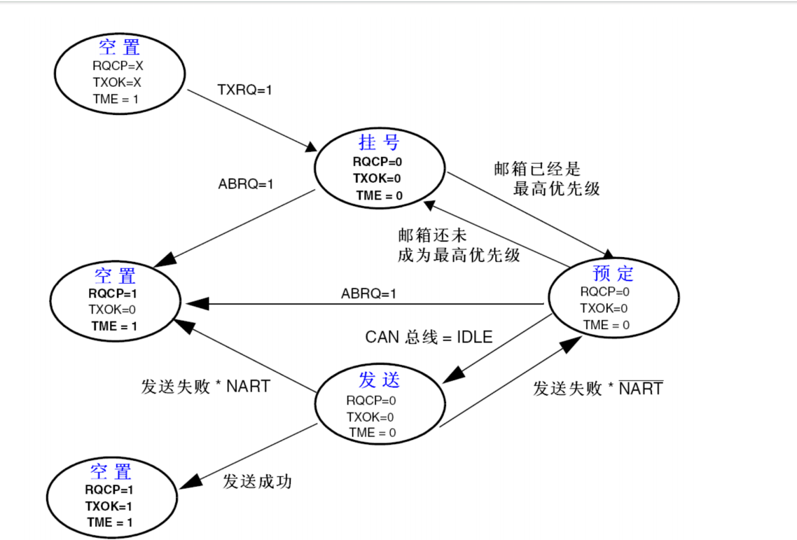 - CAN总线处于空闲状态,最先开始发送消息的单元获得发送权。(先到先得)。