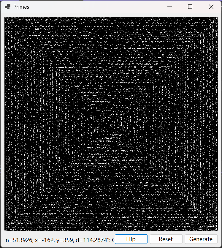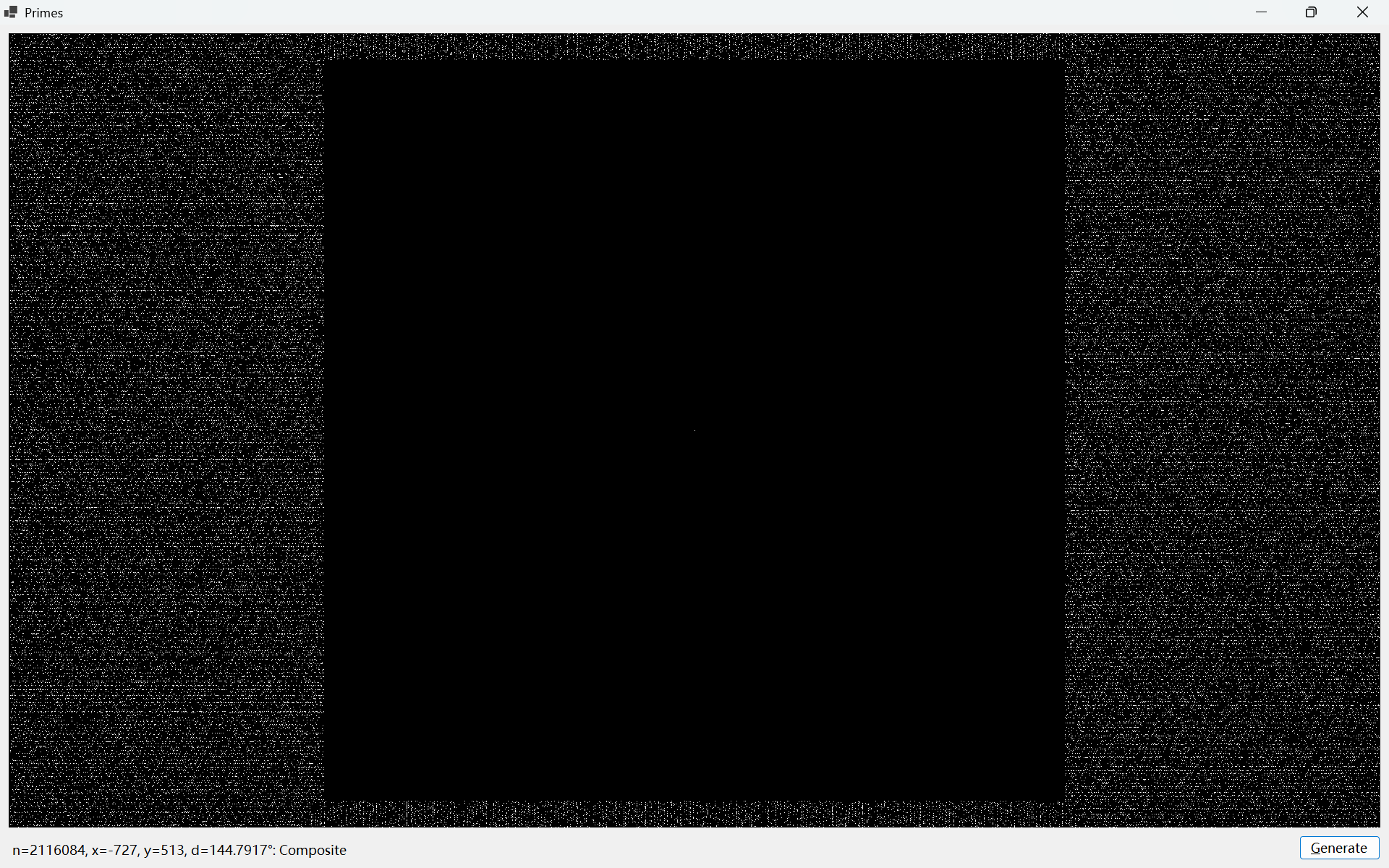以下是将近整个屏幕(分辨率1920*1200=2304000)将近200万个整数的螺旋,其中白色的点为质数,黑色的点不是(比如0和1既不是质数也不是合数).