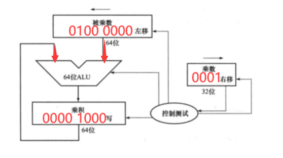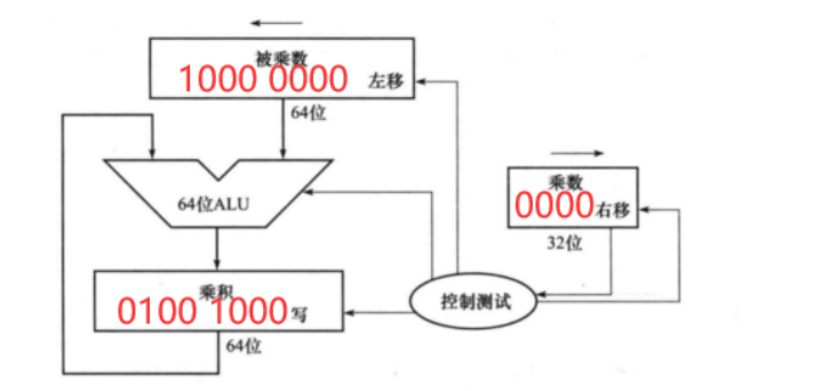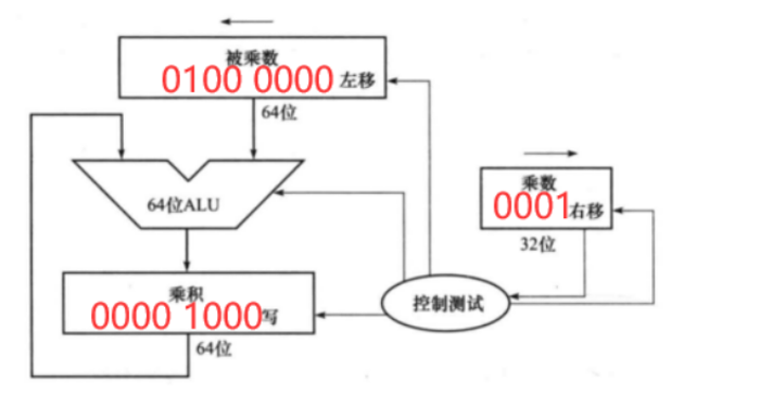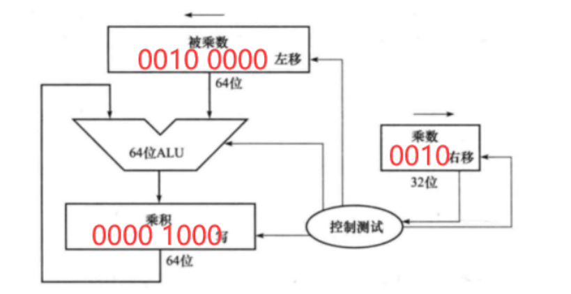 现在来看在计算机的硬件上是怎么实现的:三个方框代表三个寄存器,最上面的那个寄存器是用来放被乘数的,它同时还要实现左移的功能,右边的那个寄存器用来放乘数,它同时还要实现右移的功能,最下面的寄存器是用来保存部分积和最终结果的。长得像V字型的是ALU是用来进行加法计算的:把不断移位的被乘数去和最下面寄存器里存的积不断地相加,如果乘数是1就把移位之后的被乘数和最下面存的部分积送到ALU中进行相加再送回最下面的寄存器中,如果乘数是0那就啥也不用做,只需要把乘数再右移就行了,图中的控制测试是用来判断取出的乘数的最低位是0还是1。
