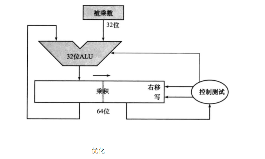 我们简化了乘数寄存器,把64位的ALU也简化成了32位的,我们的乘积寄存器分为高32位和低32位。那我们的乘数寄存器去哪了呢,大家看我们乘积寄存器的右半部分有个右移,只有乘数才会有右移操作,所以其实我们是把乘积寄存器的低32位用来放乘数同时实现右移功能,乘积寄存器的高32位用来放部分积和结果。同时大家看我们的被乘数寄存器没有左移功能,那怎么把被乘数放在合适的位置上呢,其实把乘积右移也行。比如1011*11我们可以看成先把1011放在乘积寄存器的高位上,10110000...然后把10110000...右移一位变成01011000...,因为我们的乘积寄存器是前32位和被乘数相加,所以本来应该是被乘数左移一位和部分积相加,现在部分积右移一位加上被乘数,所以加起来结果也是一样。我这里优化的内容写的不太好,图好像也有问题,时间紧,读者可以读其他关于这部分的内容。