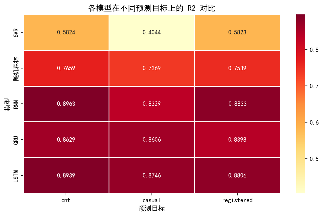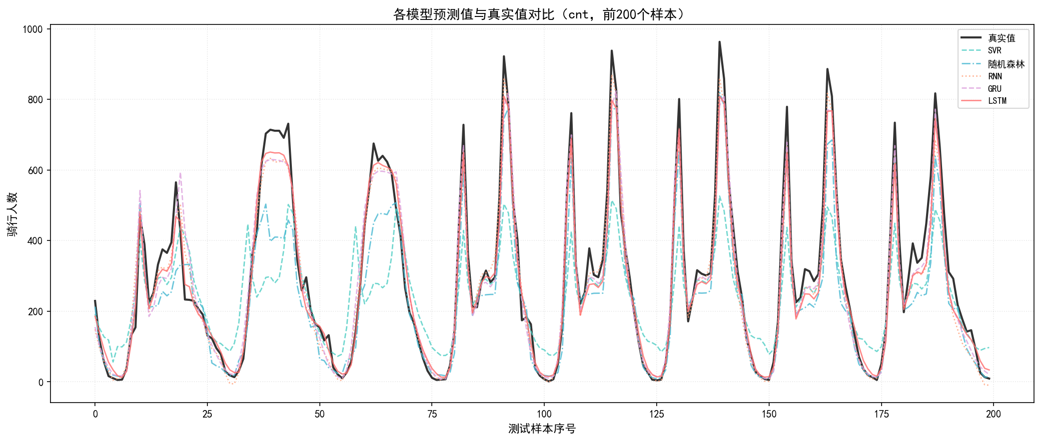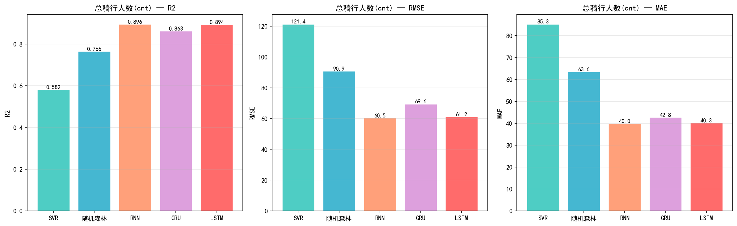 实验结果表明,LSTM模型在总骑行人数预测上取得了R2=0.8939、RMSE=61.21的最优表现,显著优于SVR(R2=0.5824)和随机森林(R2=0.7659)等传统机器学习方法,同时在临时用户和注册用户的预测上也均优于其他对比模型。结果验证了LSTM在共享单车需求时序预测任务中的有效性和优越性。