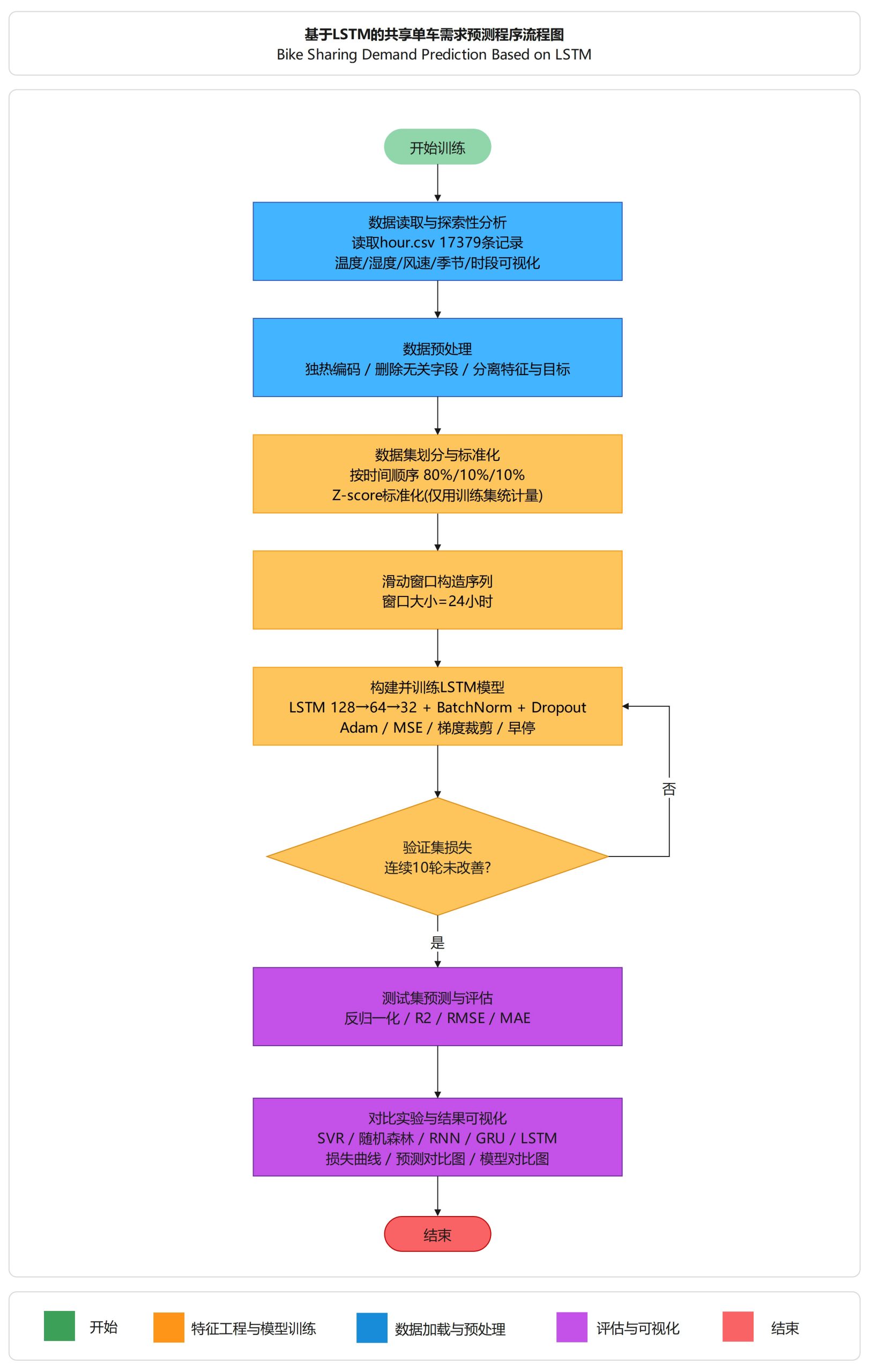 数据经独热编码、Z-score标准化(仅用训练集统计量)和24小时滑动窗口构造为三维序列,输入三层LSTM(128→64→32,含BatchNorm+Dropout),以Adam+早停+学习率衰减训练,预测cnt/casual/registered三个目标并以R²/RMSE/MAE评估,最后与SVR、随机森林、RNN、GRU四个基线模型进行对比实验。