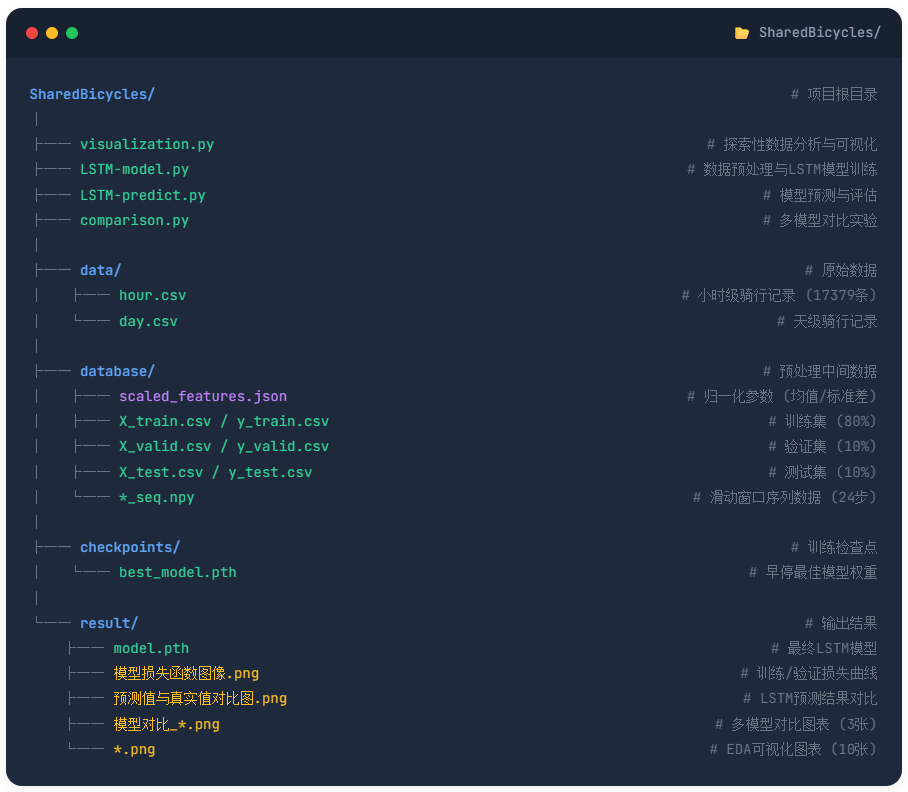 共享单车作为城市绿色出行的重要方式,其需求受天气、时段、季节等多因素影响且呈现复杂的非线性时序特征,准确预测骑行需求对运营商合理调度车辆、减少资源浪费具有重要意义,传统统计方法难以捕捉长期时序依赖关系,而LSTM凭借其门控机制在时间序列建模上具有天然优势,因此本项目采用LSTM构建共享单车需求预测模型。