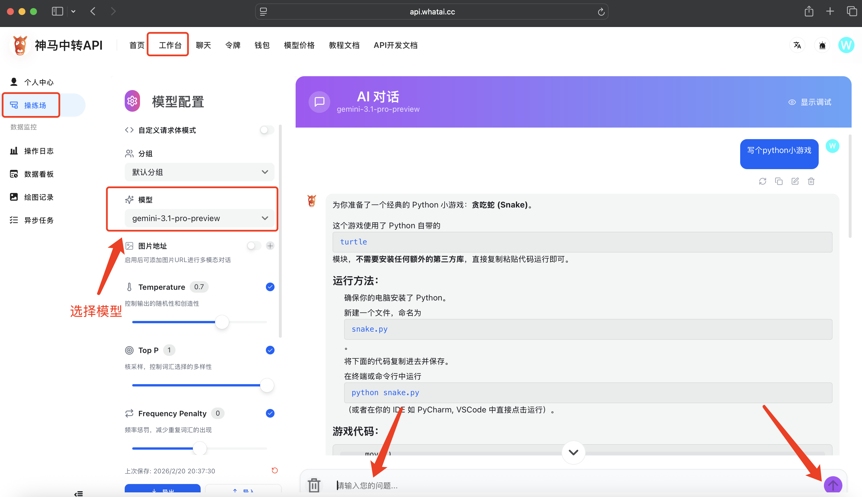 首页-工作台-操练场选择模型gemini-3.1-pro-preview,输入问题测试使用或者API接入