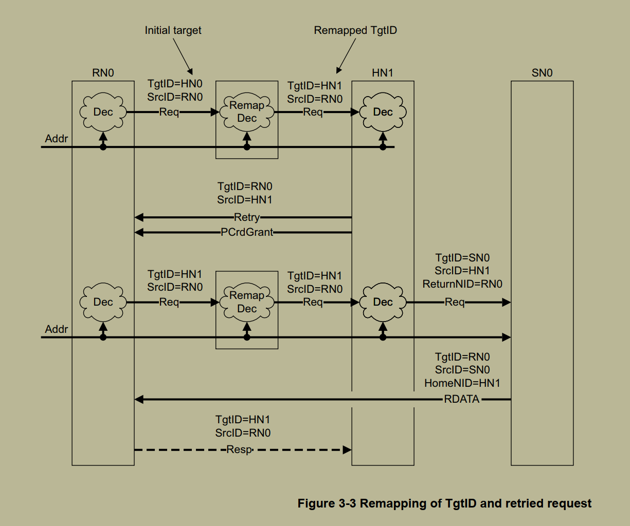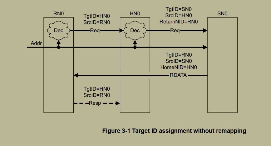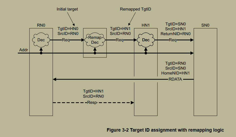 只有来自 RN 的请求的目标 ID 被重映射。事务流程中所有其他包的 TgtID 的确定方式与第 3-138 页的简单流程类似。