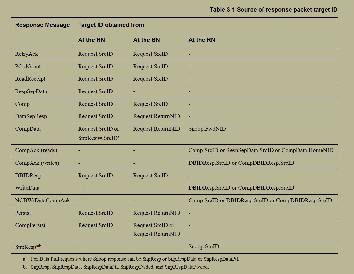 响应包是作为接收到消息的结果而发出的。响应包中的目标 ID 必须与导致发送该响应的接收消息中的 SrcID 或 HomeNID,或 ReturnNID 或 FwdNID 匹配。表 3-1 显示了每种响应消息类型的响应包目标 ID 的来源,以及接收消息中确定目标 ID 的字段。