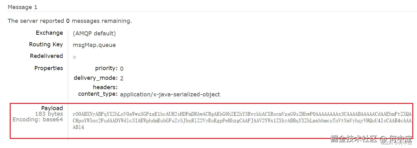 添加完成后,再次发送消息,查看RabbitMQ管理平台的消息,可以看到json格式的消息要小得多