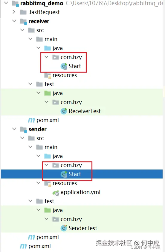 打开IDEA,创建一个项目(rabbitmq_demo),项目下有两个服务模块(发送者sender,接受者receiver)