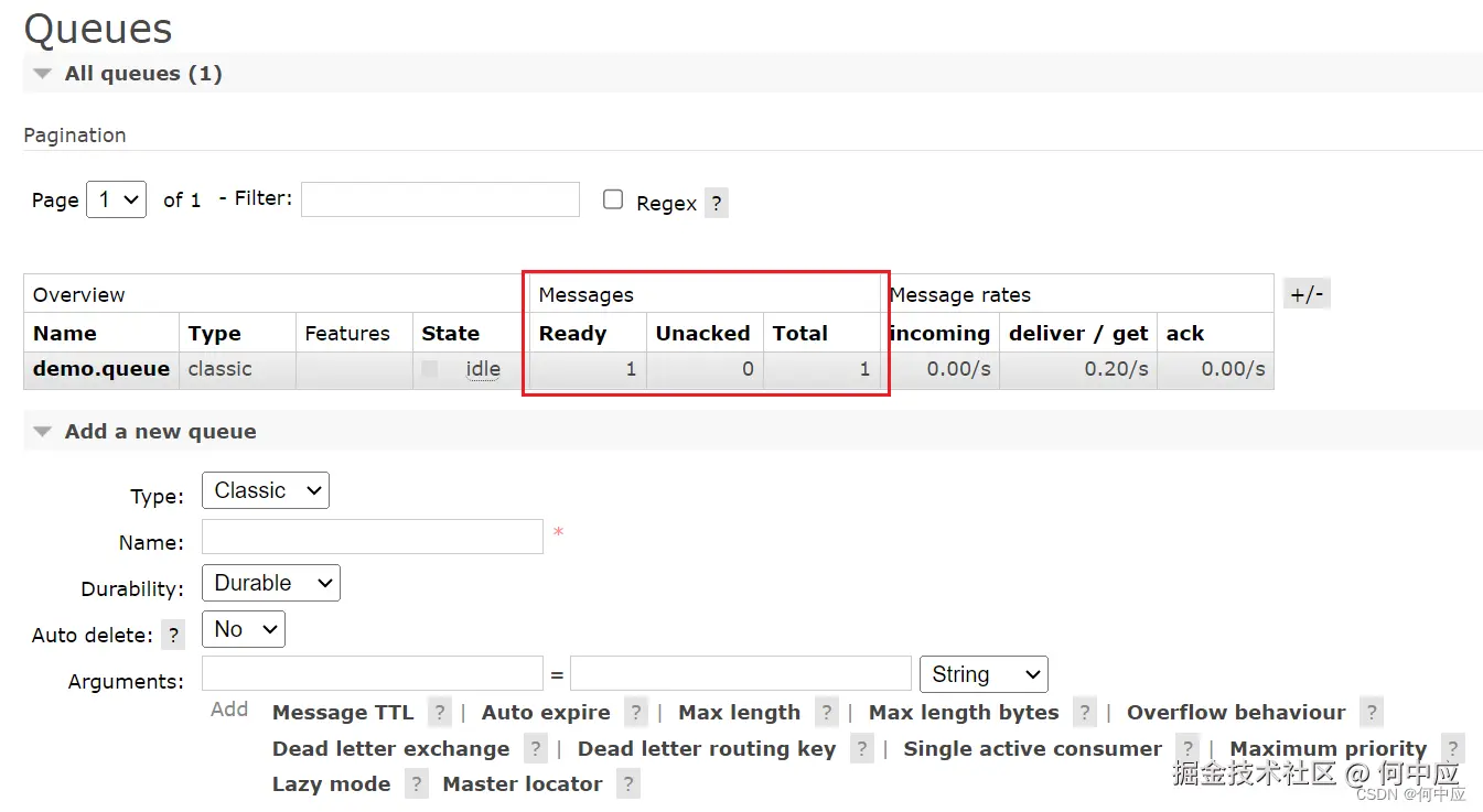 (启动接收端测试代码,此时RabbitMQ管理平台会创建一个demo.queue队列)