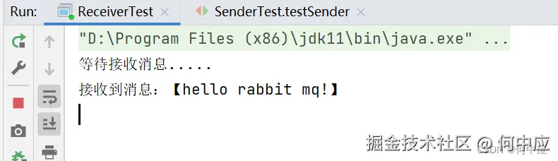 因为是首次使用,此时RabbitMQ管理平台还没有队列,如果启动发送端,消息会被丢失,因为找到不到对应的队列。所以,可以先启动接收端,接收端会在管理平台创建对应的队列,或者可以先在管理平台手动创建队列。