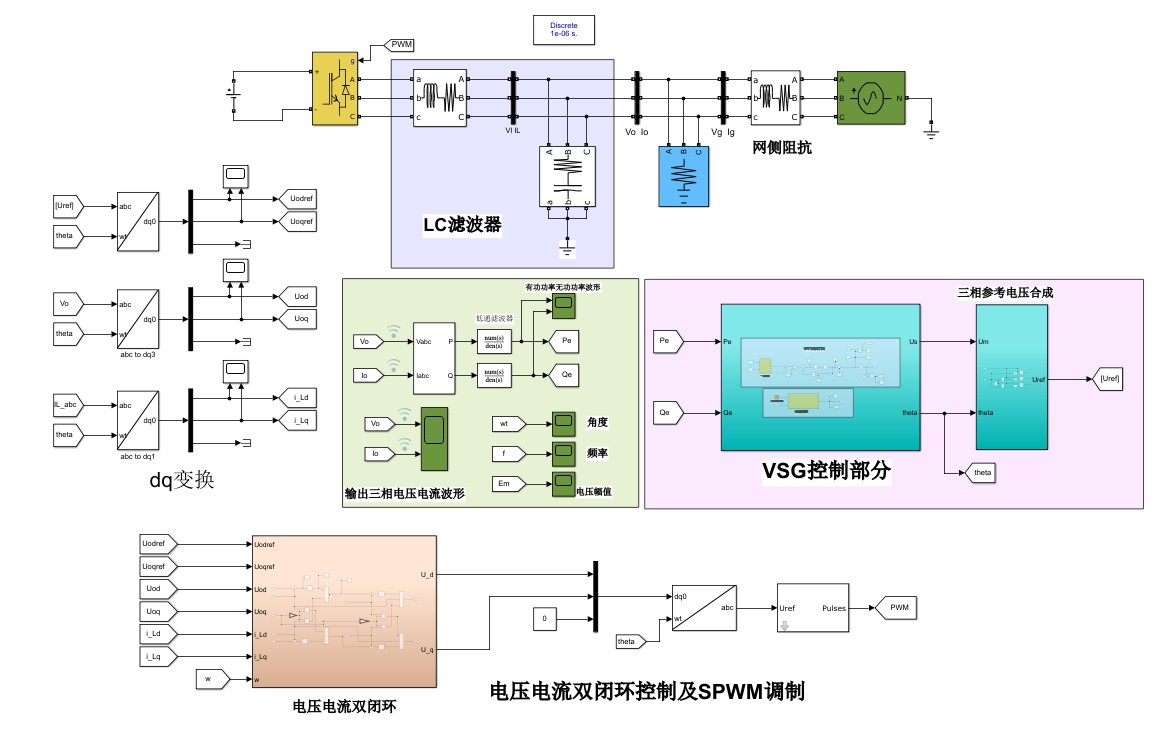 虚拟同步发电机有功无功跟随并网仿真【带参考文献】 [1]复现一篇参考文献:《虚拟同步发电机并离网切换控制策略研究 高洪献》 [2]控制结构:VSG并网仿真模型中,有功频率环、无功电压环、SPWM调制都是参考文献搭建、LC滤波器、参数都是参考该文献算出来的,经典电压电流双闭环控制 解耦 [3]仿真效果: ①有功功率给定:设置了有功功率参考值阶跃以及无功功率参考值阶跃,仿真结果显示可以实现有功无功 的无静差跟踪 ②直流母线电压:设定参考值800V【可以自己设定】,当系统发生扰动时,母线电压仍然能迅速跟踪给 的值 ③VSG输出的电压电流波形THD均<5%