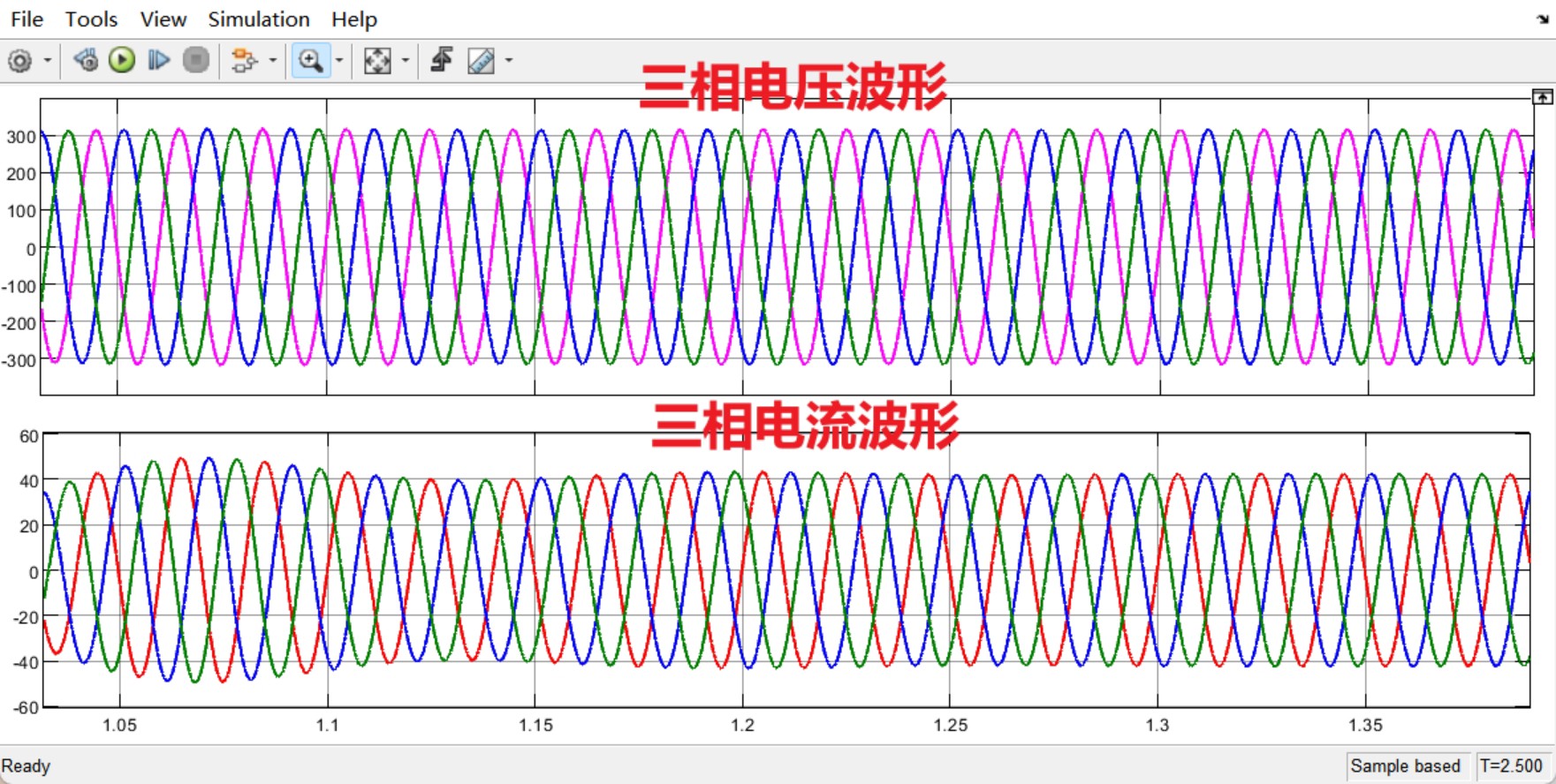 SPWM调制部分用到了SVPWM模块,这里有个隐藏知识点------载波频率和采样时间的配合。当开关频率设10kHz时,仿真步长必须小于1/(2*fsw),否则会出现奇怪的谐波。实测步长设在5e-6秒比较稳妥。