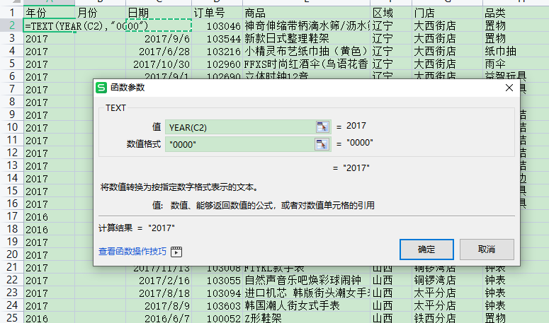 选择每日门店销售工作表,利用"日期"列的数值和TEXT函数,计算出"年份"列的内容(将年显示为四位数字)和"月份"列的内容(将月显示为不带前导零的数字)。