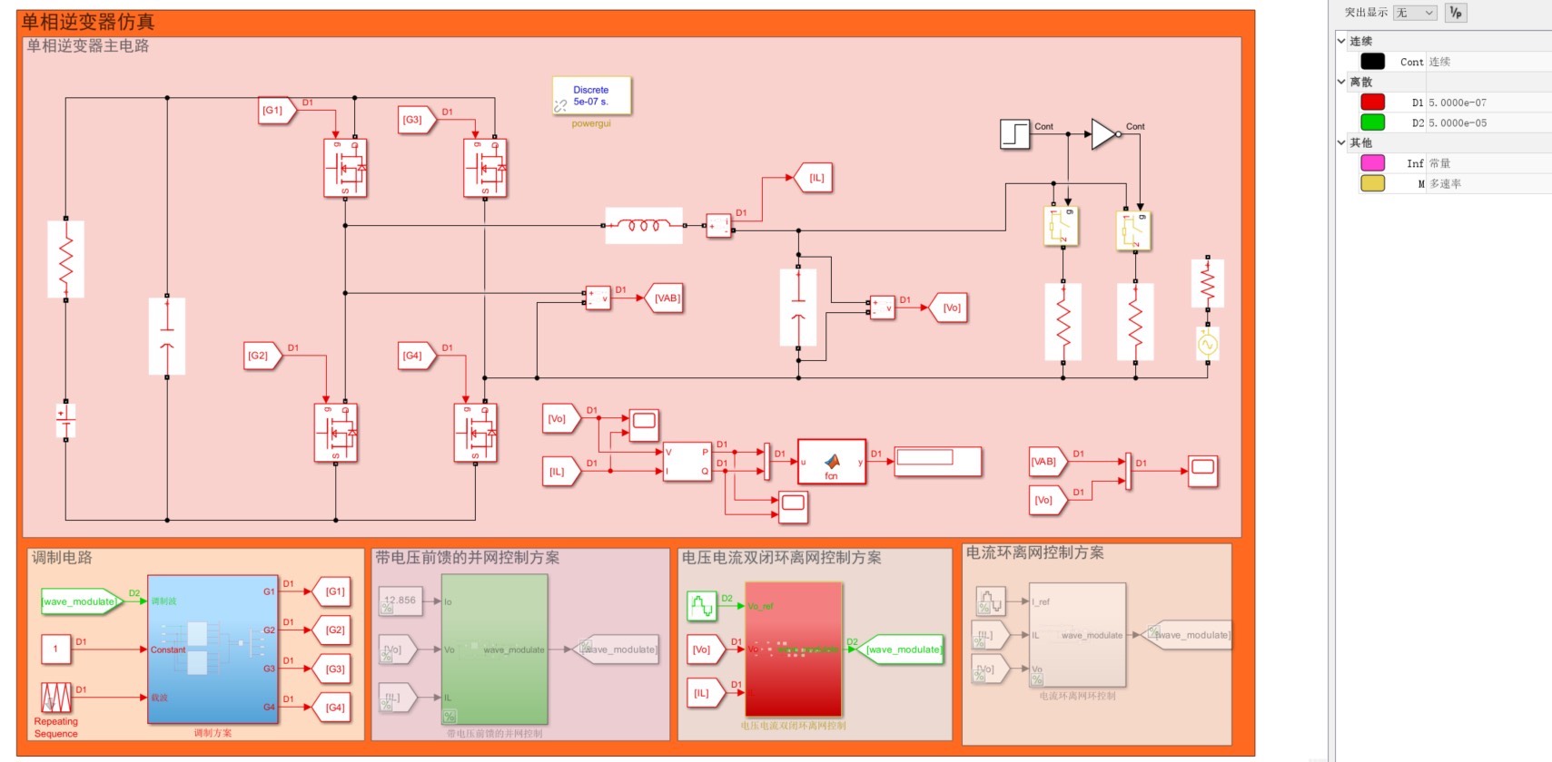 1,单相逆变器的并网和离网的控制方案,其中包括两种调制方案,3种控制方案。 具体波形见下图。