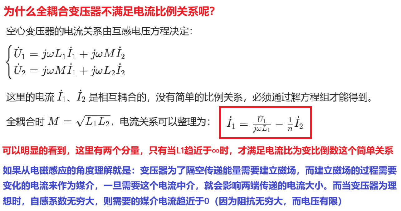 这个衰减的电流我们认为他用来空转建立磁场了,虽然建立磁场的过程不会消耗能量,但是起到一个缓存作用,使得原边的电流不能完完全全流入副边,这也是全耦合变压器的电流不满足n倍比例关系的原因。
