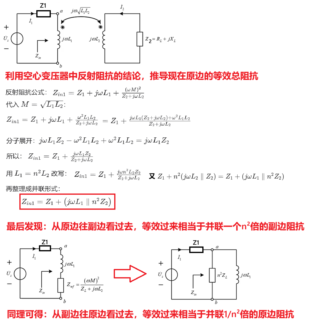 比如副边等效到原边,则是副边阻抗乘上n²倍;而原边阻抗等效到右边,则是原边阻抗除以n²倍。
