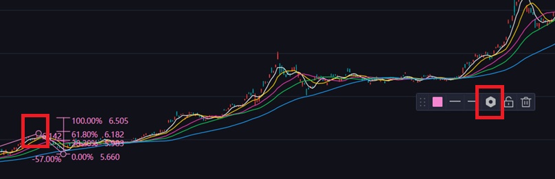 没有关系,我们先使用波浪尺用三点画一下线,再点击波浪尺上画线的圆点 ,然后点击波浪尺的设置图标: