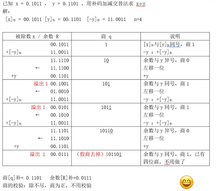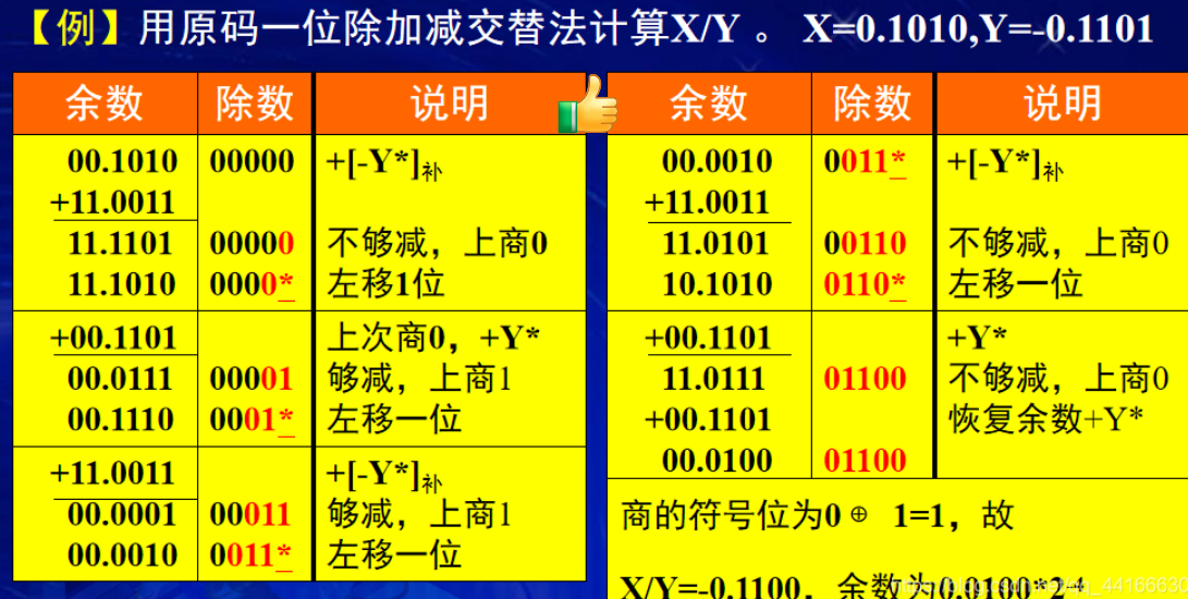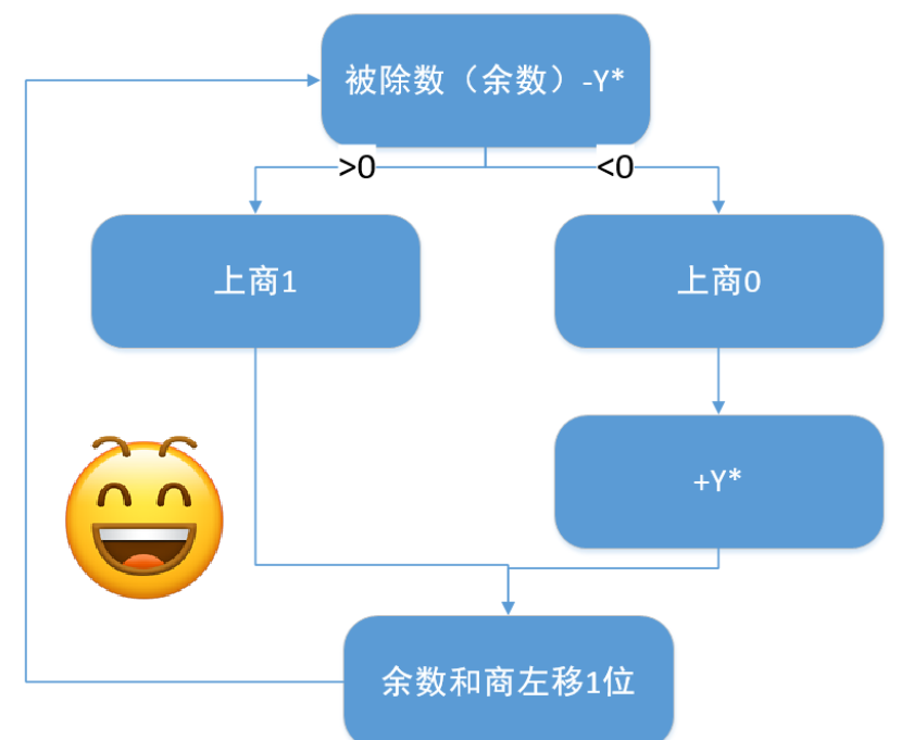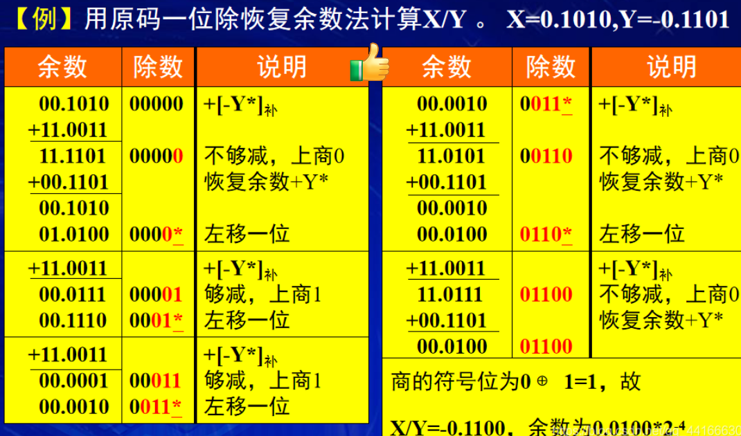若最后一步上商0(即余数小于0),则还需进行一次恢复余数,即余数再加Y*,才能得到正确的余数。