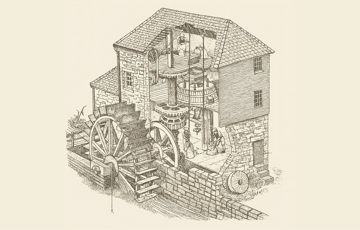 A mill with a water wheel to power its operations. Water was powerful but unreliable and restricted mills to a few locations and seasonality.