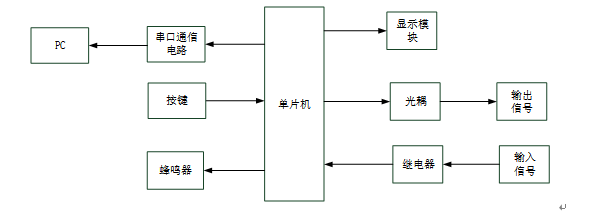 本次电力系统中的多路报警显示装置设计了如图2.1所示的系统框图。采用了STC89C52单片机来作为控制器,同时结合串口通信电路,按键,蜂鸣器,LCD液晶,光耦,继电器来完成整个电路的设计。外部的12路报警输入信号,通过继电器进行隔离后输入到单片机,而单片机的输出信号同样通过光耦进行隔离后输出到外部,以保证控制系统与外部的隔离。