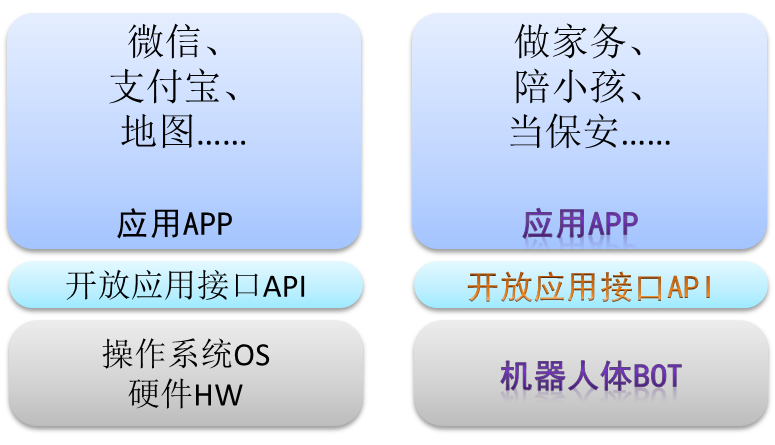 个人认为,机器人可以像电脑硬件和操作系统一样,提供一个灵巧、可靠的通用机器人体,开放API应用接口,由各类开发者去开发眼花缭乱的、各种各样的APP应用。就像智能手机满屏的APP一样,一个机器人也可以拥有一系列APP任务去执行。